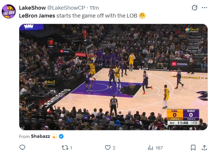 詹姆斯开场第一攻就是空接暴扣,随后两次的转换上篮轻松命中,开场湖人6分全部来自于41岁的勒布朗。考德威尔大帽勒布朗,老詹示意打手裁判无视,首节勒布朗8中5拿到10分0篮板0助攻。